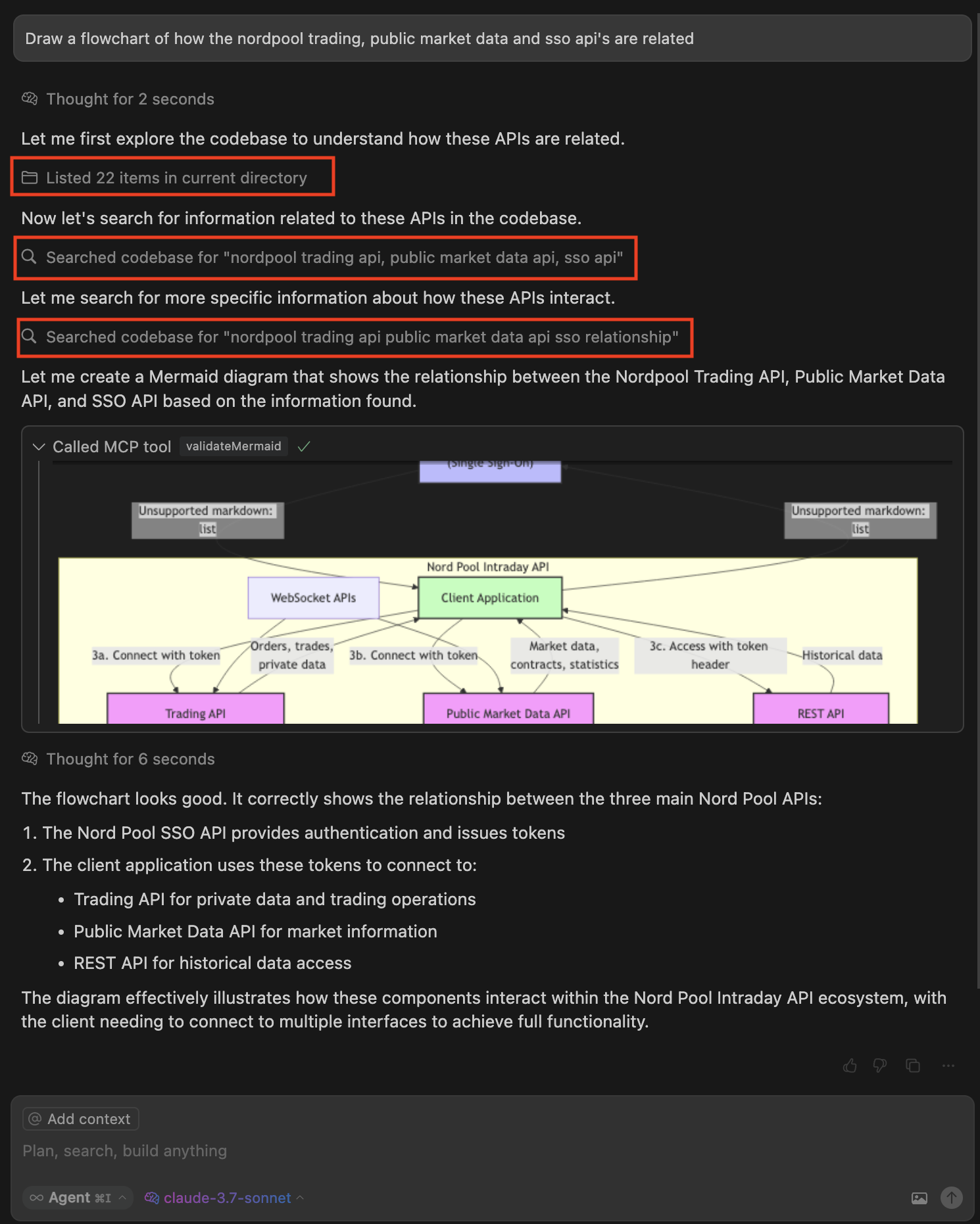Cursor zoekt hier zelfstandig in de codebase naar relevante informatie over de gevraagde APIs. Je ziet dat Cursor zoekopdrachten uitvoert om precies de juiste context te vinden, zonder dat jij handmatig hoeft te zoeken of Cursor expliciet vertelt waar te zoeken.